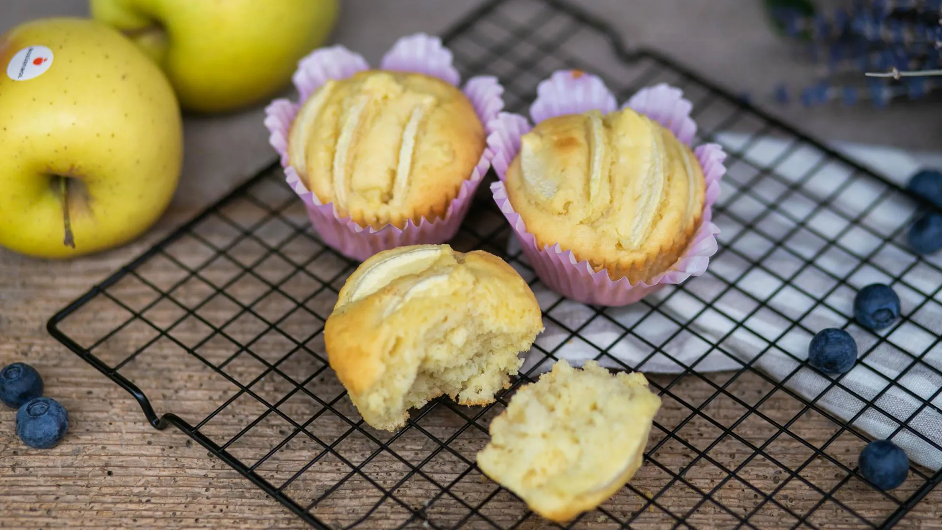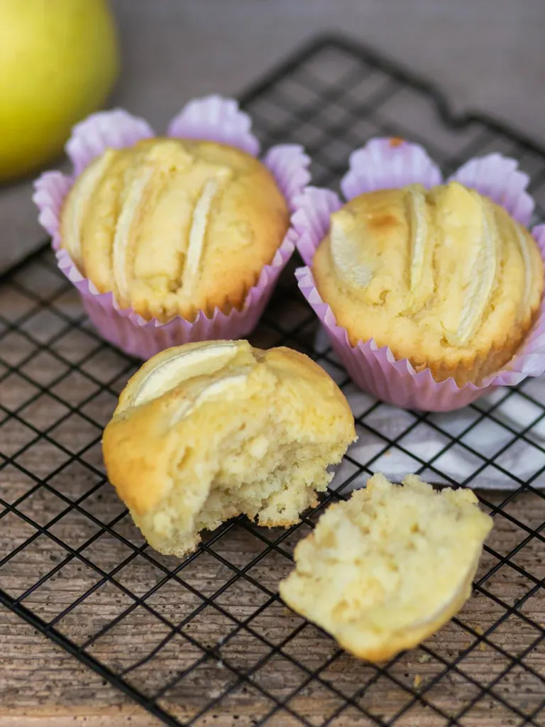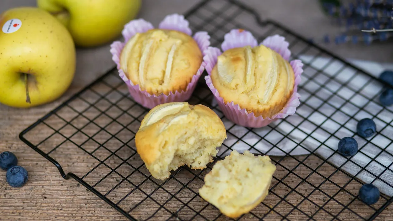 Scald the milk until it is slightly warm. Add butter, sugar and eggs and beat with an electric whisk. Combine the flour, baking powder and salt and blend until the mixture is smooth. Add the peeled and chopped apples and incorporate them. Pour the mixture into suitable moulds or cups, filling them to ¾. Place a few thin slices of apple on top. Bake in a hot oven at 180C° for about 20 minutes. Serve with a smile.