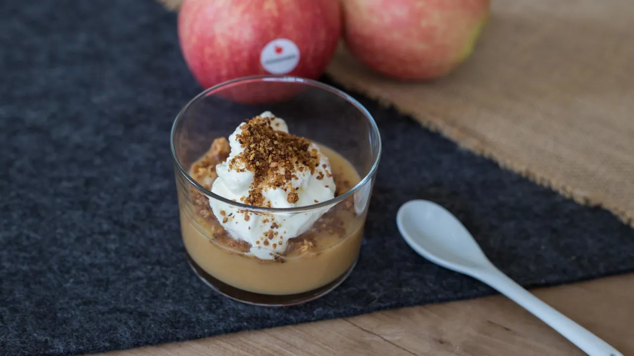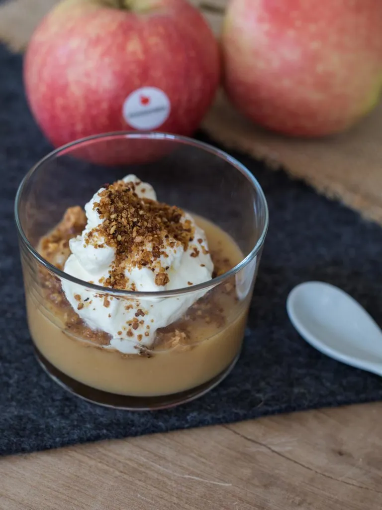 Apple compote: Peel the apples and cut into pieces. Boil briefly with a little water, lemon juice and ginger, purée and allow to cool. Add the crumbled Amaretto biscuits to the apple compote and fold in. Brittle: Gently toast the crumbled Amaretto biscuits and chopped nuts in a pan. Distribute the apple compote into glass bowls and sprinkle with the brittle. Whip the cream and top the compote with a spoonful. Finally, decorate with a little more brittle and serve with a smile.
