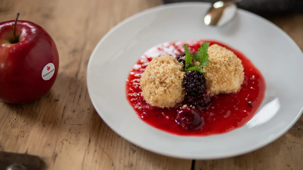 Agricoltrice bio Astrid serve: Canederli alle mele.
