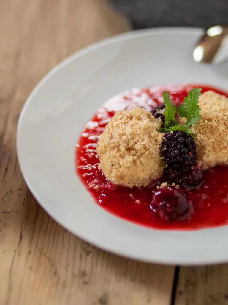 Sbattere il burro ammorbidito con lo zucchero e l’uovo, aggiungere il quark, un pizzico di sale, zucchero vanigliato e scorza di limone. Saltare i cubetti di mele nel burro, sfumare con l'acquavite e ridurre il liquido di cottura. Insaporire con un pizzico di cannella i cubetti di mele a temperatura ambiente e mescolare al quark. Per ultimo aggiungere la farina. Lasciare riposare l’impasto in frigorifero per almeno 1 ora. Nel frattempo tritare le noci e mescolarle al pangrattato. Tostare il pane e le noci in un padellino con poco burro per alcuni minuti e lasciar raffreddare sopra un piatto. Formare piccoli canederli e farli cuocere a fiamma bassa per 8-10 minuti in acqua bollente leggermente salata. Togliere i canederli dall'acqua con una schiumarola e rigirarli nella granella. Per la salsa ai frutti di bosco mescolare il succo di mele con il preparato in polvere per il budino alla vaniglia e cuocere in padella, aggiungere i frutti di bosco e lasciare cuocere per qualche minuto. Infine lasciare raffreddare la salsa ai frutti di bosco e servirla assieme ai canederli con un sorriso.